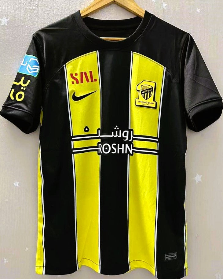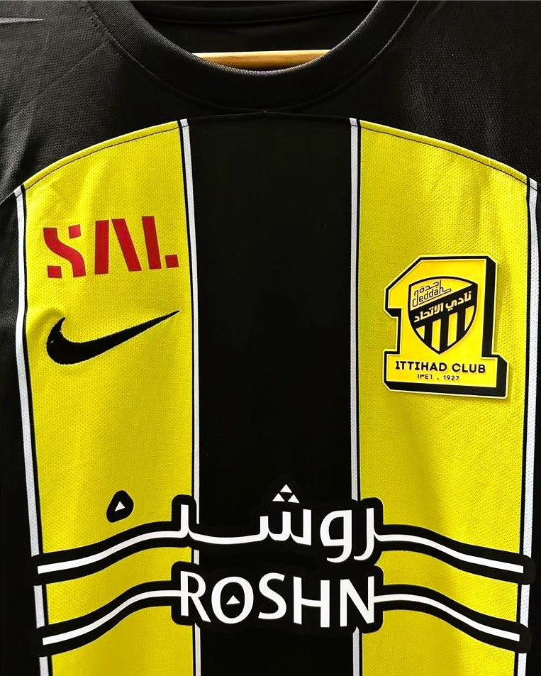 Una nuova frontiera del calcio è rappresentata in questa maglia dell' Al Ittihad 2023-24 con il numero 9 di KARIM BENZEMA. Una divisa che rappresenta il futuro di un nuovo calcio, con la personalizzazione del fuoriclasse francese a sancire e legittimare la nascita di nuovi orizzonti calcistici