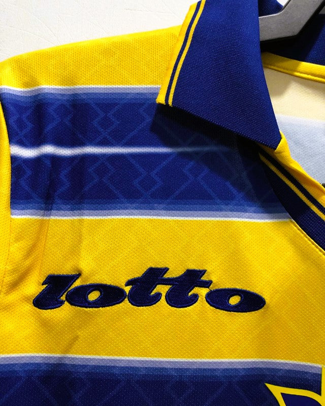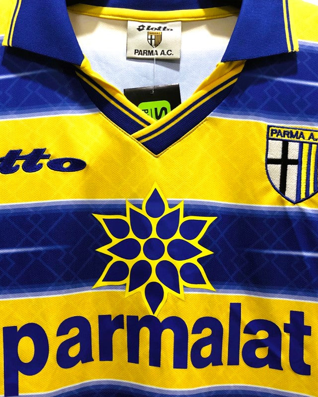 Rivivi la storia del Parma tornando alla stagione 1998-99 grazie alla maglia indossata con il numero 1 da GIANLUIGI BUFFON. Realizzata splendidamente, rappresenta il culmine della storia del club emiliano con questa perla indossata dal giovane astro nascente destinato a diventare il più forte portiere della storia