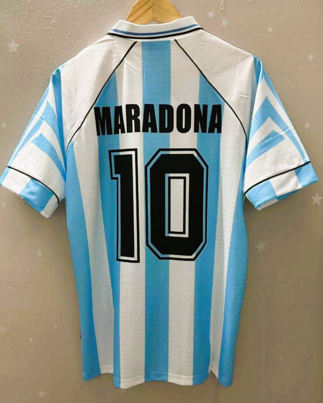 Rivivi la storia dell'Argentina grazie alla maglia numero 10 indossata da DIEGO ARMANDO MARADONA. Realizzata per la stagione 1994-95 e utilizzata ai Mondiali di Usa '94, celebra magnificamente la nazionale albiceleste guidata dal leggendario Re Diego
