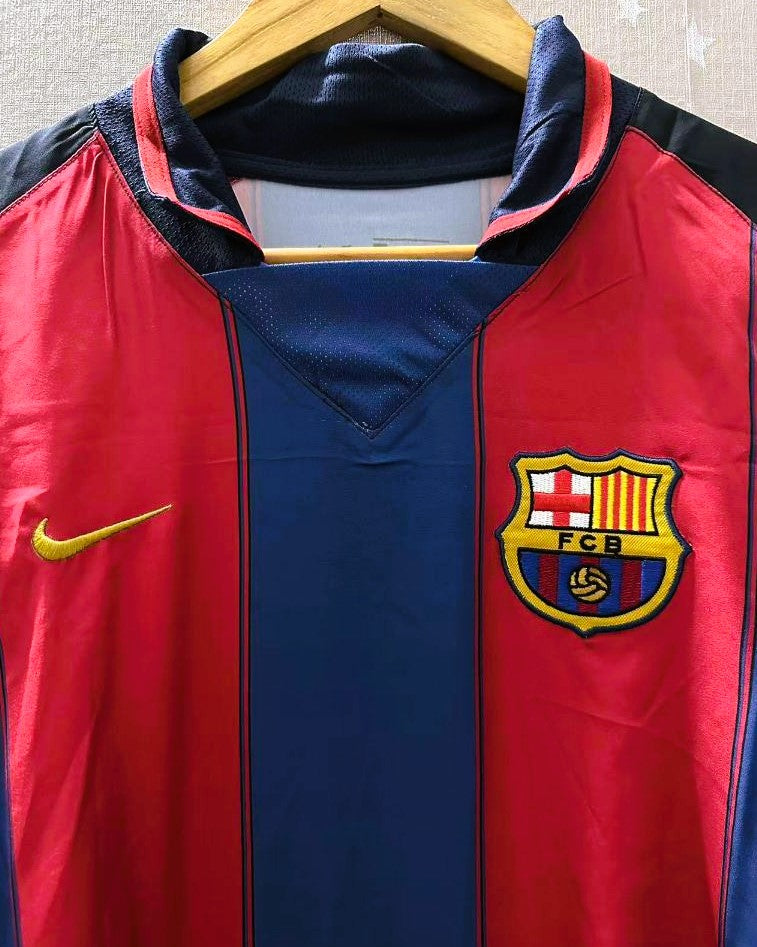 Benvenuti nel cuore pulsante del calcio con la maglia del Barcellona 2003-04, una creazione Nike con il numero 10 di RONALDINHO. Questo capolavoro arricchito dalla patch della La Liga, cattura il sorriso incantevole e il talento straordinario del funambolo brasiliano, amatissimo idolo della tifoseria blaugrana