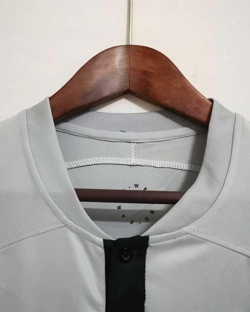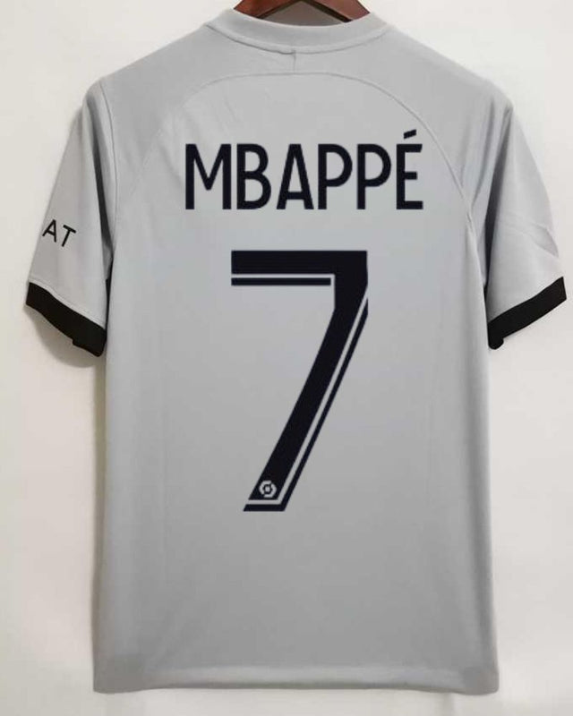 The Paris Saint-Germain jersey for the 2022-23 season, worn with number 7 by KYLIAN MBAPPE', is an authentic masterpiece of design that embodies the essence of Parisian charm. Completely grey and embellished with black inserts, it is a combination of elegance and determination created by Nike Jordan with the personalisation of the phenomenal French striker