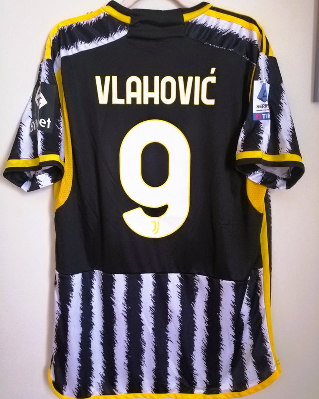 La maglia della Juventus della stagione 2023-24 con il numero 9 di DUSAN VLAHOVIC, celebra la tradizione del club bianconero votato al futuro. Arricchita con la patch della Serie A, evidenzia la personalizzazione dell'attaccante serbo riconosciuto come uno dei giocatori più forti del panorama internazionale